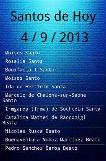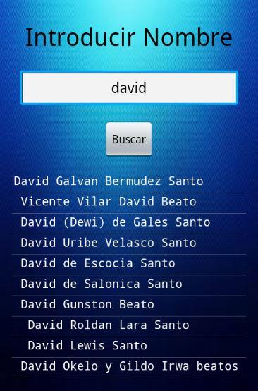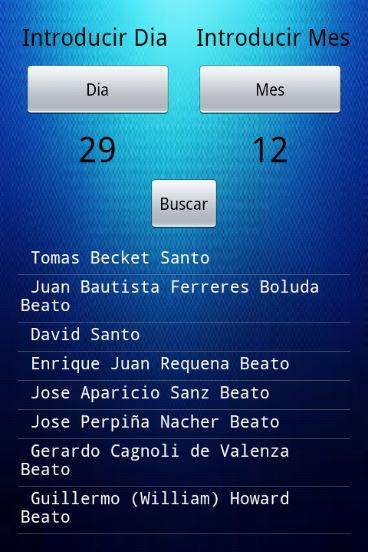 Esta aplicación es mi proyecto final en la 4ª edición del curso "Desarrollo de Aplicaciones Móviles con Dispositivos Android" que organiza la Escuela de Posgrado -> http://core.ugr.es/android/.Santos Dia is an application that lets us know the names of the saints every day, and also to seek the saints held for a specific date or, discover how many saints have the same name as you. Thanks to this application we can keep track of the days onomastic of colleagues, friends and family, and in this way, Do not forget no card!