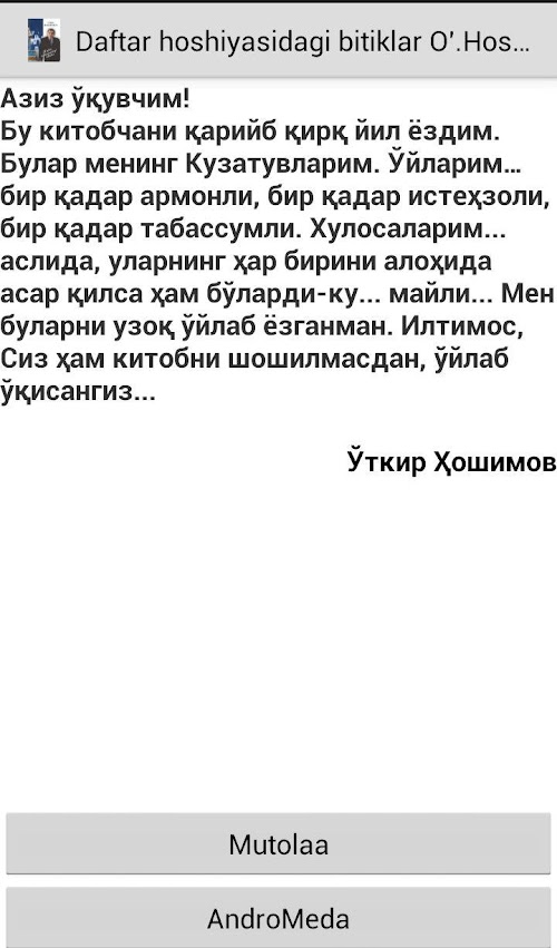 Бу китобчани қарийб қирқ йил ёздим. Булар менинг Кузатувларим. Ўйларим… бир қадар армонли, бир қадар истеҳзоли, бир қадар табассумли. Хулосаларим... аслида, уларнинг ҳар бирини алоҳида асар қилса ҳам бўларди-ку... майли... Мен буларни узоқ ўйлаб ёзганман. Илтимос, Сиз ҳам китобни шошилмасдан, ўйлаб ўқисангиз...