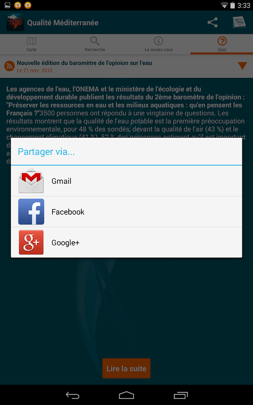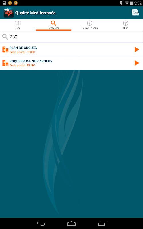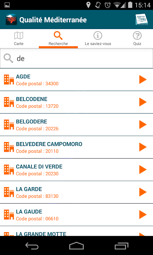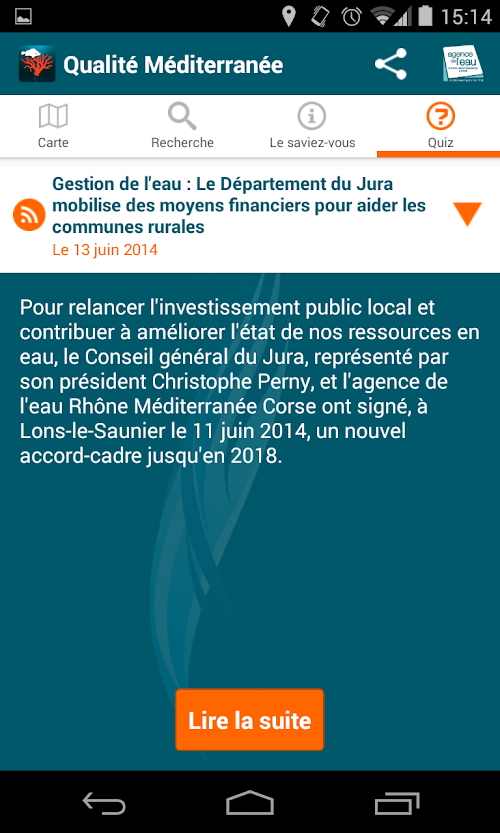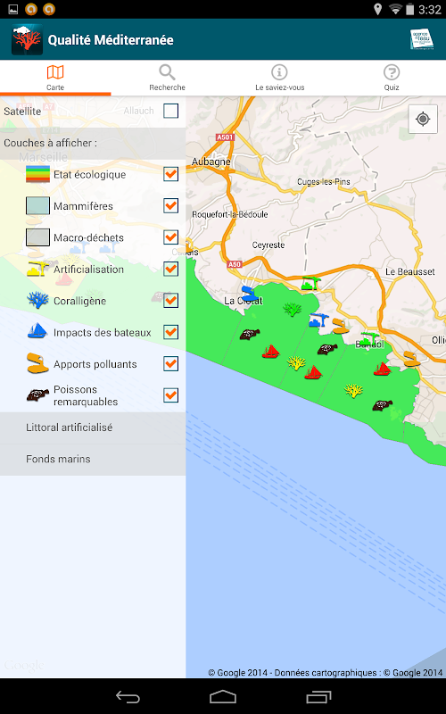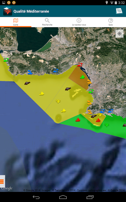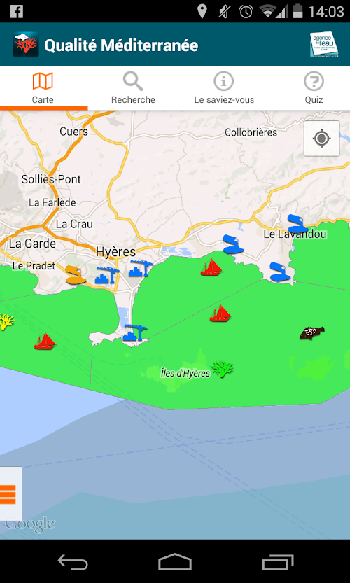 Vous aimerez aussi l'appli Qualité Rivière et l’appli Donia.With the app "Quality Mediterranean" the water agency Rhone Mediterranean Corsica, discover health of the Mediterranean . Territorial waters of the open sea, Gulf of Lion to the French Riviera and Corsica, you will know the quality of the water and seabed. State coral, quality Posidonia meadow, concreting of coastal impacts boats, transfers land pollutants, the presence of groupers and corbs two protected species, charts and Wildlife flora ... All these data, evidence of the health of the Mediterranean, are also provided.