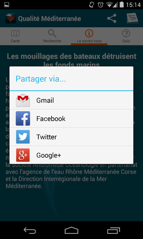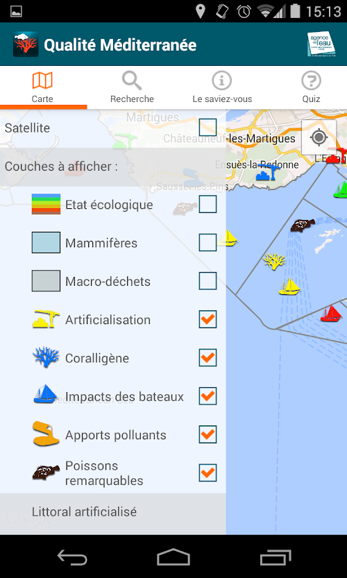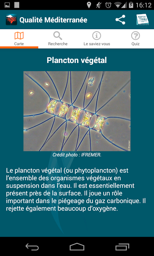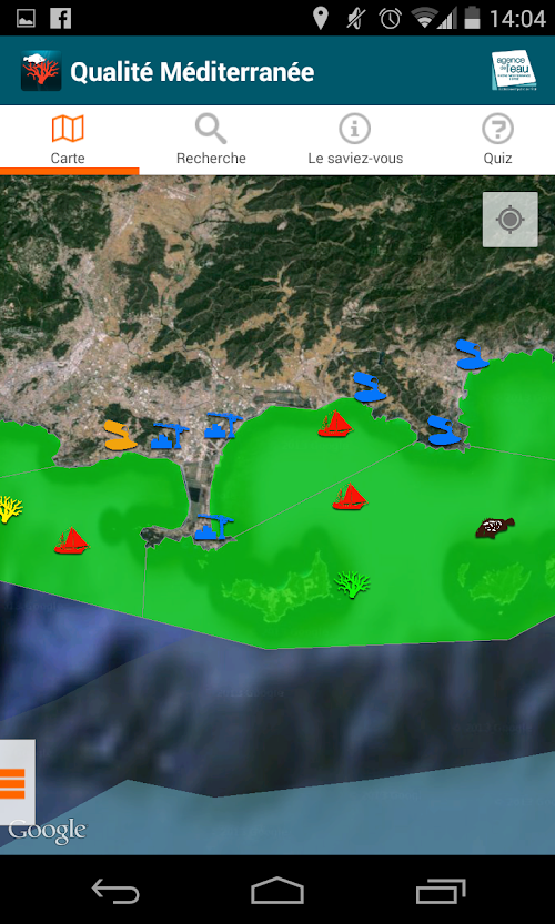 This application is at the initiative of the Water Agency Rhône Méditerranée Corse , a public institution of the State dedicated to the protection of water , rivers to the sea Expert of the sea, she coordinates the monitoring networks of health of coastal and marine waters. 500 monitoring points in France measure the chemical pollution, marine biology but also uses sea, marine debris or invasive species. Moreover, the water agency receives tax paid by all water users: households, communities, industry, agriculture ... Every euro collected is reinvested with authorities, economic actors, farmers, scientists and associations act set standards for sewage treatment plants, renewing drinking water systems, water saving, protecting drinking water catchment pollution by pesticides and nitrates, restore the natural functioning of rivers, preserve coastal and sea