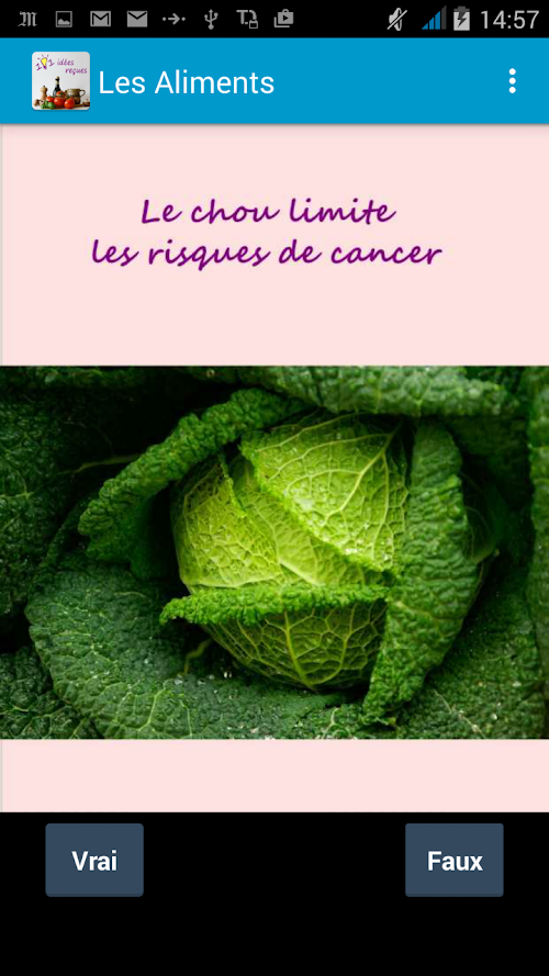 Testez, de façon ludique, vos connaissances sur les aliments et l’alimentation, choisissez si chaque idée est vraie ou fausse. L’application vous donnera la bonne réponse et vous expliquera pourquoi.