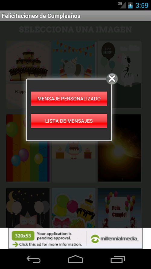 Podemos utilizar la app escogiendo entre algunas de las estupendas imágenes o fondos que vienen con Felicitaciones de Cumpleaños y a las que además podemos añadir un texto personalizado escrito por ti mismo, o seleccionar alguno de los que también vienen con la app especialmente indicados para el motivo principal de la herramienta Los Cumpleaños.