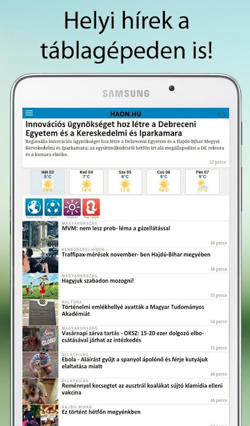 +++ Az alábbi kategóriákban folyamatosan friss és érdekes híreket találsz: Debrecen és Hajdú-Bihar megye, Rendőrségi hírek, Jegyzetek, Magyarország, Nagyvilág, Gazdaság, IT hírek, Sport, Bulvár.+++ If you install the app, you will not miss any important local hírről either, since the largest events we push notification message.