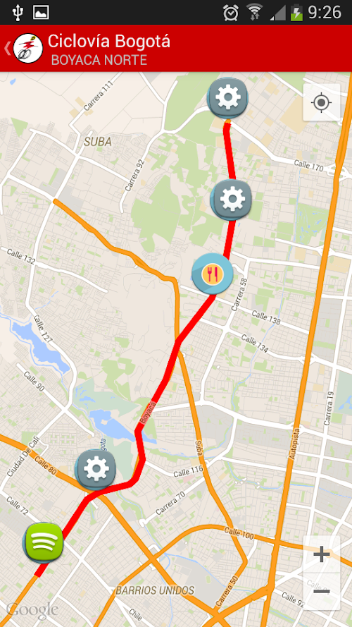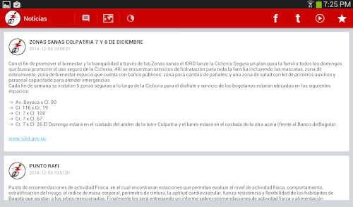 De igual manera la aplicación contribuirá en generar hábitos saludables, en razón a que cada usuario tendrá a su disposición la posibilidad de ingresar, además de los datos personales, su respectivo peso, y talla que cruzados con los recorridos a realizar y las distancias correspondientes, le indicaran las calorías que ha quemado, la velocidad promedio, la distancia total recorrida y demás reportes que contribuyen en el desarrollo de una actividad física planificada. The District Institute for Recreation and IDRD Sport, aware of his missionary spirit, considers it appropriate and advisable to involve your offer on new technologies, for which advances the development of a mobile application in Bikeway, considered the program increased recognition and participation in the institution, likewise the Bikeway Bogotá has been declared of social, recreational and sporting interest under the Agreement 386 of 2009.