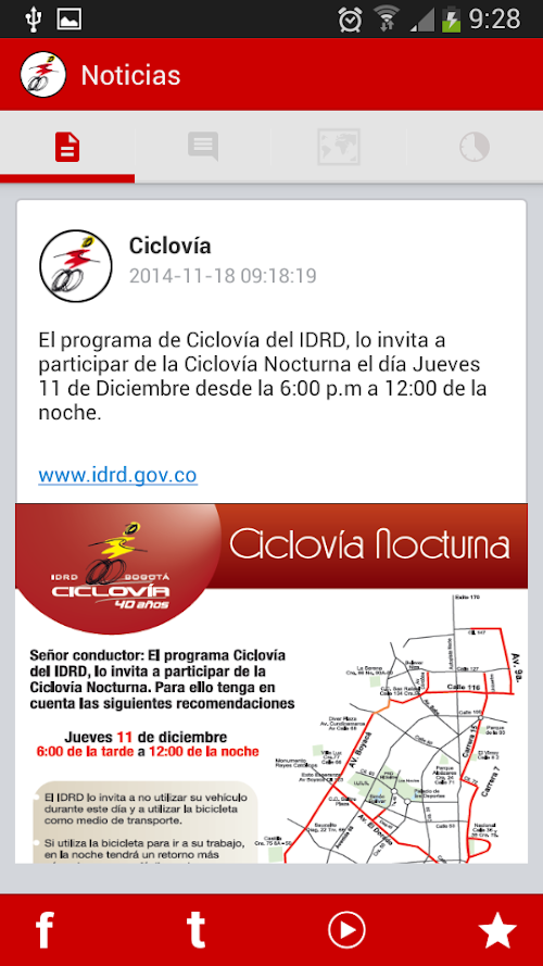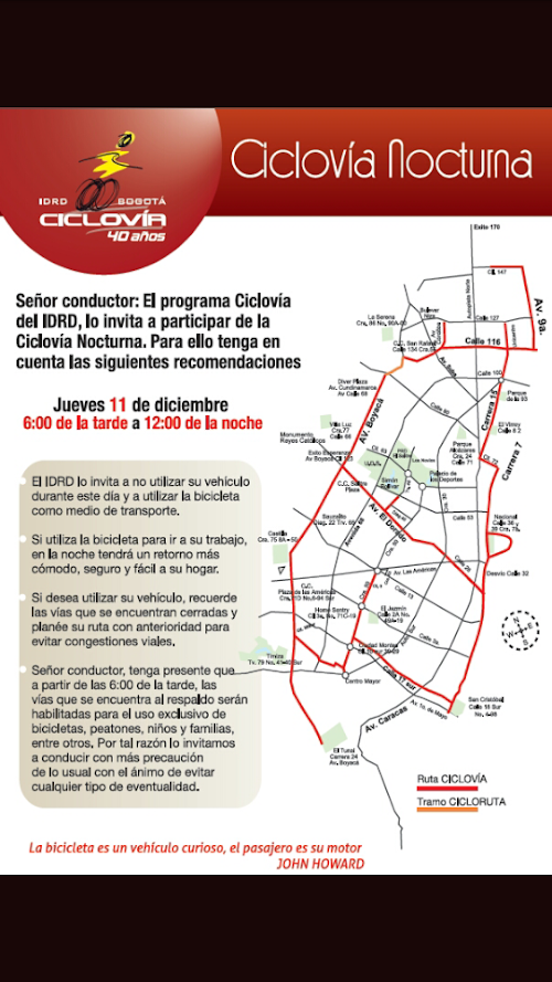 El Instituto Distrital para la Recreación y el Deporte IDRD, consciente de su misionalidad, considera oportuno y conveniente involucrar su oferta en las nuevas tecnologías, para lo cual adelanta el desarrollo de un aplicación móvil en la Ciclovía, considerado el programa de mayor reconocimiento y participación en la institución, así mismo la Ciclovía de Bogotá ha sido declarada de interés social, recreativo y deportivo según el Acuerdo 386 de 2009.