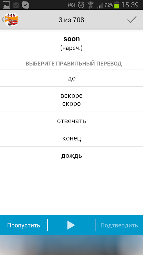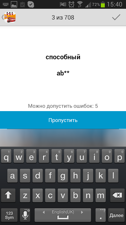 • 4 exercises to choose from: "Russian translation", "Translation into English", "Dictation" and "Guess the word."