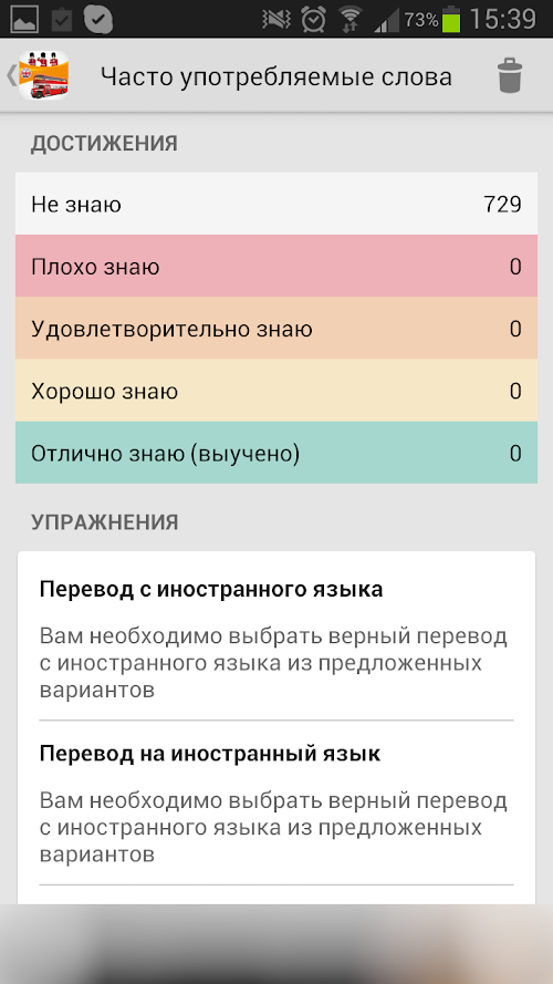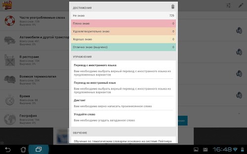 • 4 варианта упражнений на выбор: "Перевод на русский язык", "Перевод на английский язык", "Диктант" и "Угадай слово".