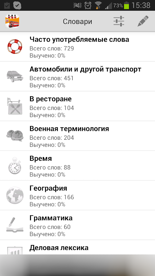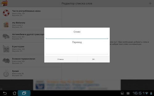 More than 700 of the most common English words presented in the appendix. PRO version includes more than 5000 words. All words have sounded transcription and native English speaker. Additionally, the app gives you the opportunity to create their own specialized dictionaries, adding there own words or by selecting them from the common vocabulary.