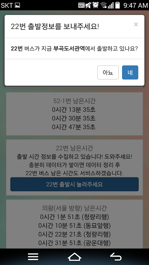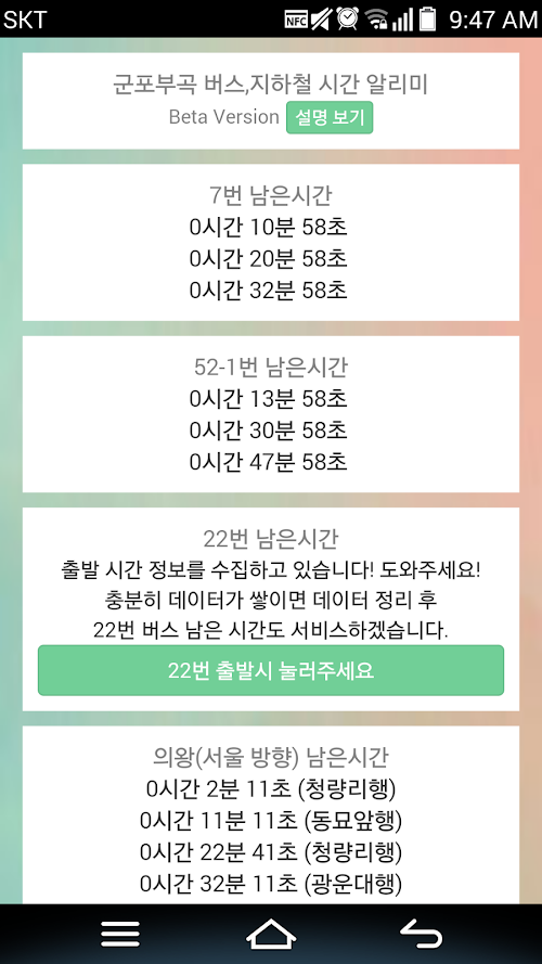 22번 버스 시간 등록 및 확인 부분 대폭 개선! 이제 지금까지 등록된 22번 버스 시간 목록을 보실 수 있습니다.