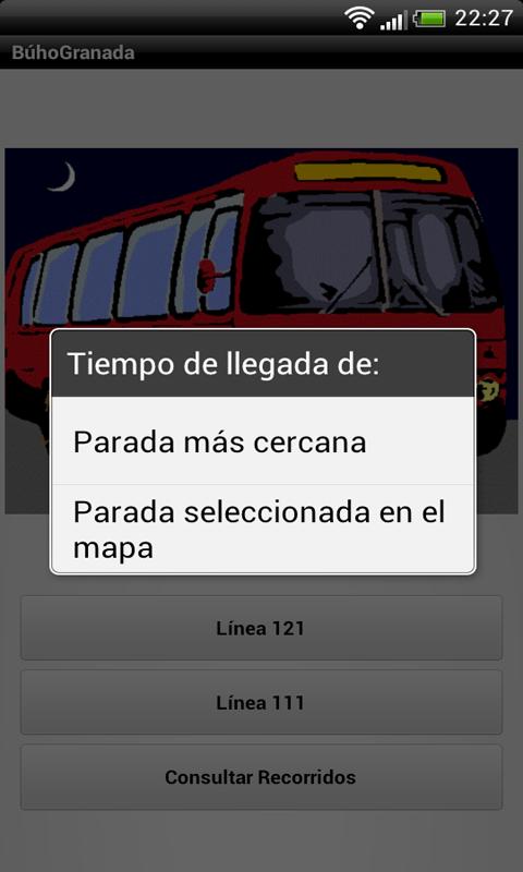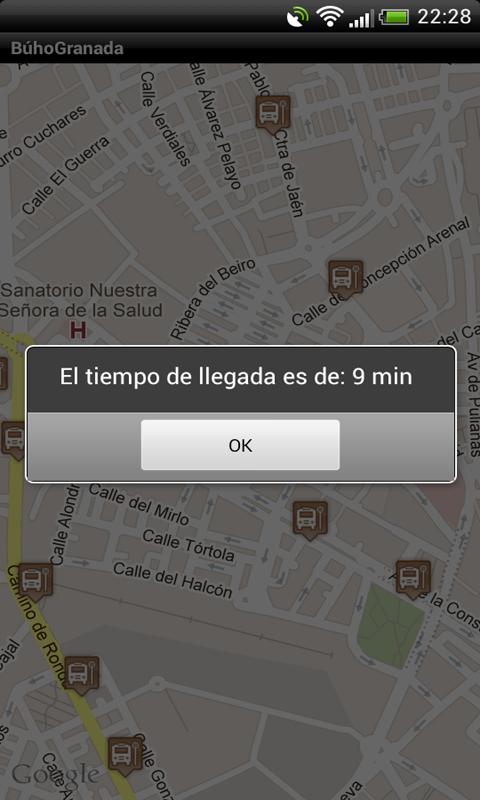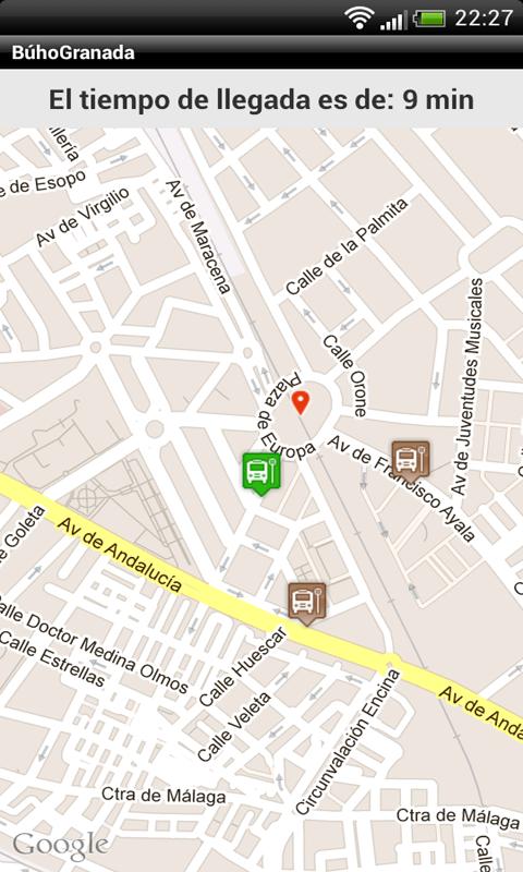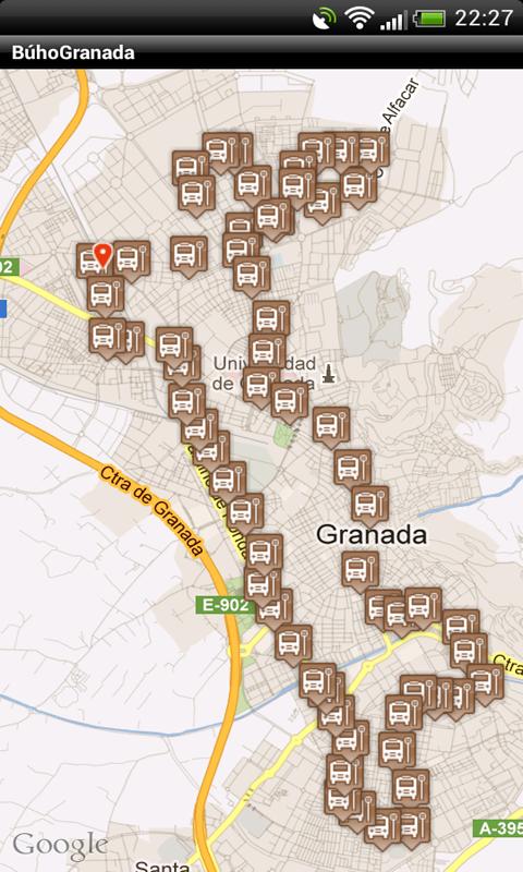 GranadaBúo te permite conocer el tiempo restante, del bus nocturno, para llegar a tu parada más cercana o a una que selecciones en el mapa.