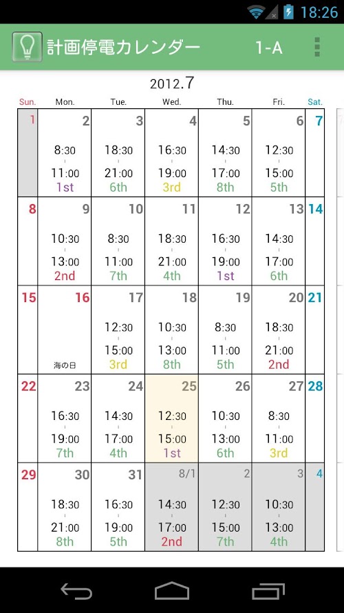 ウィジェットをタップすると計画停電カレンダーが表示され、今後の計画停電の予定を確認することが出来ます。画面のスワイプによって、2012年9月までの予定も確認出来ます。