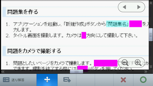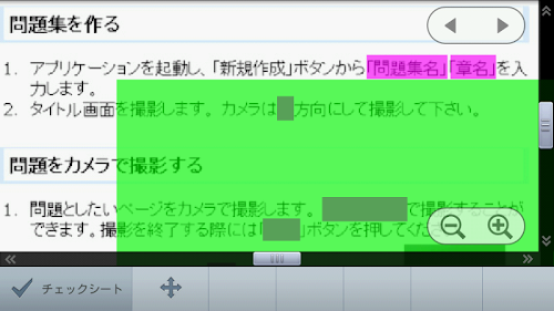 In the "make your own collection of problems", photographed the collection of problems you have on your own with the camera, you can memorize the study with a marker in the check pen to photos taken. Since the place wearing a marker is Masu Enakunari seen by putting the check sheet, you can see the answer by shifting the check sheet from the self-answer in your head. In addition to the check sheet mode, hiding all the place wearing a marker, continue to answer while displaying one after the other "Feed answer mode" also features. Self scoring function is also equipped with, you can, such as the accuracy rate of where you want to memorize also recorded.