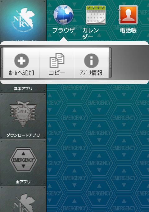 ・各タブ(グループ)の中のアプリアイコンを長押しすると、ホームへショートカットアイコンを追加したり、基本タブ以外のタブにコピーしたり、アプリ情報を確認できます。
