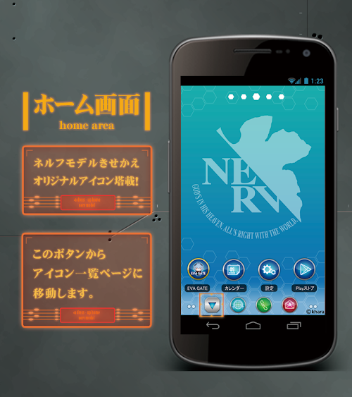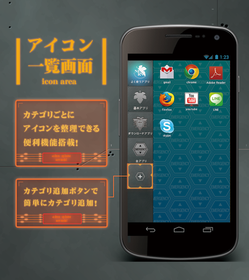 エヴァスマホきせかえオリジナルの壁紙&8種のアイコンや、カテゴリ分けが便利なアイコン管理画面も搭載!