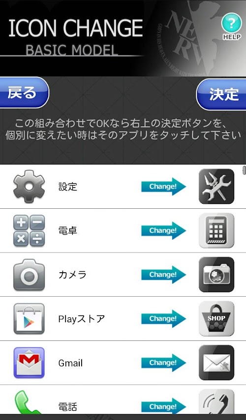 電話やGmailなどの基本アプリ(端末によって異なります)がデフォルトで設定されますので、「change」矢印が付いているアプリとアイコンの組み合わせがそれで良ければ、画面右上の「決定」ボタンを押してください。