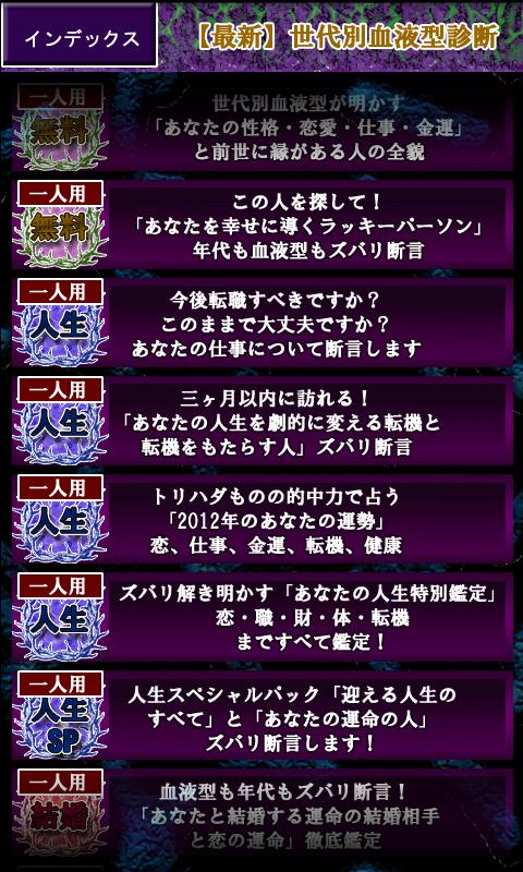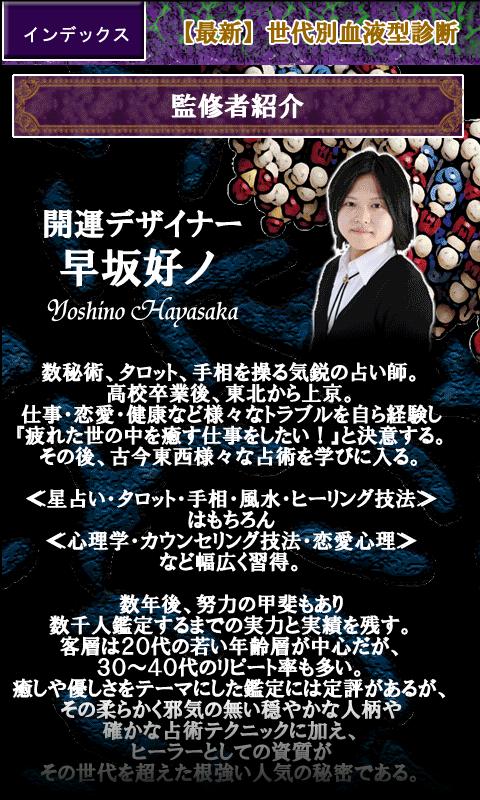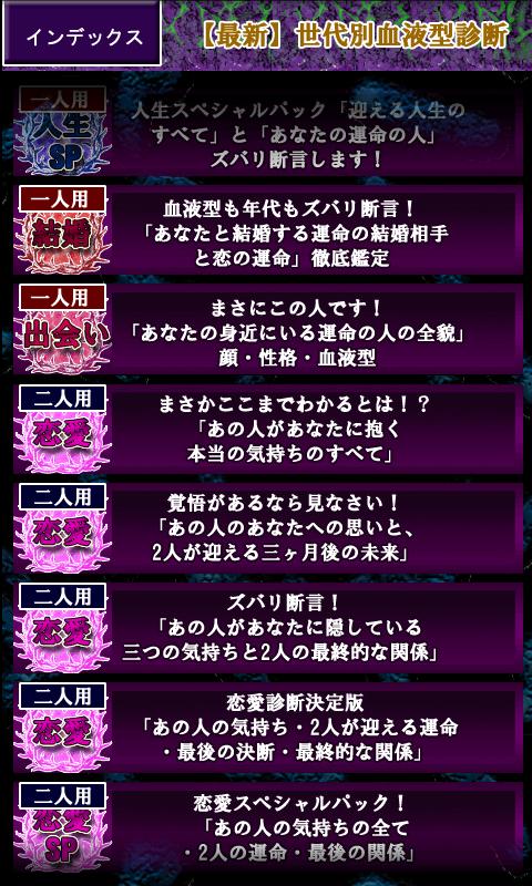 A型、O型、B型、AB型でみる普通の血液型診断ではなく、本コンテンツでは生まれ(誕生世代)と、血液型(A型、O型、B型、AB型)を組み合わせることによって血液型の遺伝子が導く変えられない宿命と、生まれから年を経て変わるあなたの運命を詳細に、そしてズバリお教えするコンテンツとなっております。