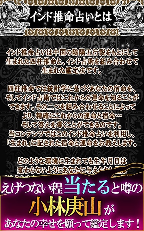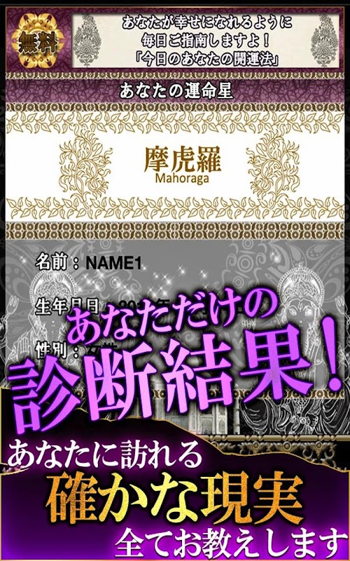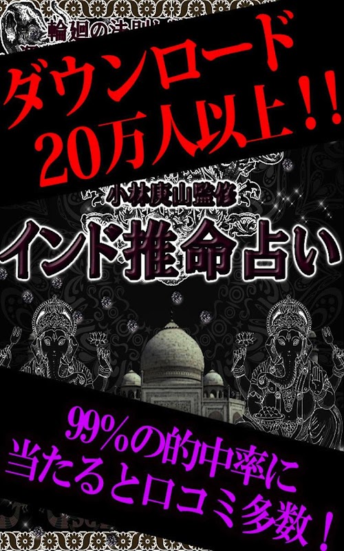 20万人以上がダウンロードの“当たる”と話題の超人気アプリ「ハッと息を飲むほどよく当たる」 神秘の究極的中占い「インド推命占い」があなたの運命の全てをズバリと見抜きます。