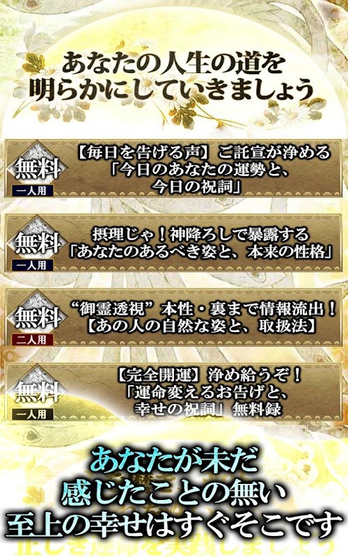 This version of 【的中ランク1位】本当に当たる占い「大祓日神示」 Android App comes with one universal variant which will work on all the Android devices.