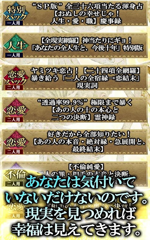 特別鑑定メニューは16メニュー。自らのことを知り、そして心赴くままの現実を知ることで、苦しみという穢れを洗い落とすことができるのです。恋・仕事・将来への不安。ここですべて洗い落としていきなさい。