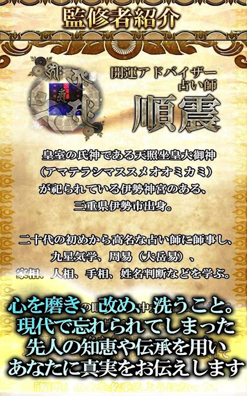 Yahoo占い2013年上半期売り上げランキング1位。痛烈なまでに当たり、裏まで見抜く、当たると口コミの占い師たちがそろう「運泉館」でも人気の鑑定士「順震」。予約がなかなか取れない本物の鑑定をお楽しみください。