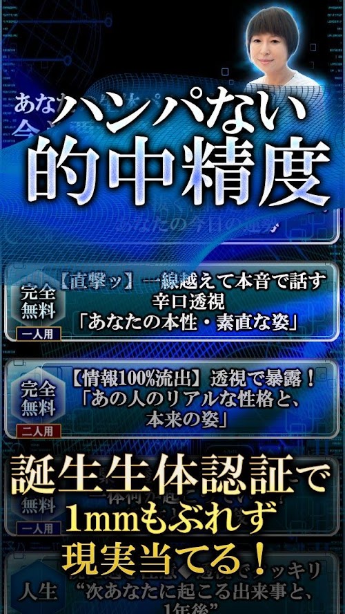 その他14メニューを提供!あなたという生体は大宇宙の中の一つの構成要素です。バイオレコードはその構成の一つ一つを分析し、占うことであなたという人間の「運命」すべてを明らかにしていきます。 さあ、もうわからない未来に対して怯える必要はありません。すべてを数値化し、「見える化」すること。むやみに不安になるのはやめてください。幸せは見えているのですから。