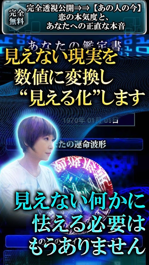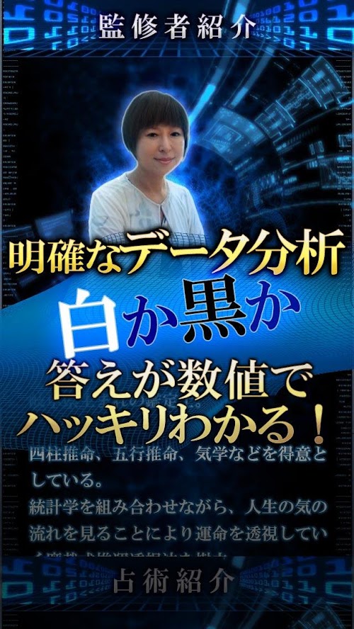 今、あなたは何をすべきなのか。どんな時期なのか。誕生日から生体透視を行うことにより、バイオレコードを作成、そのバイオレコードから良い時期、悪い時期を判別し、鑑定を行います。
