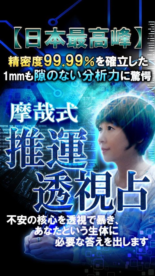 精度99.9%。人体の組成から見る「生体透視占い」であなたについて鑑定します。あなたの誕生日からその組成を導き出し、バイオレコードを算出することであなた自身が現在立たされている状況を99.9%当てます。監修者はその独自の透視法を確立した「摩哉」。渋谷を中心に当たると口コミで広がり、今、予約が最も取れないと言われる鑑定をお楽しみ下さい。