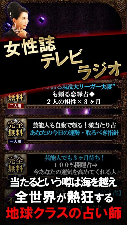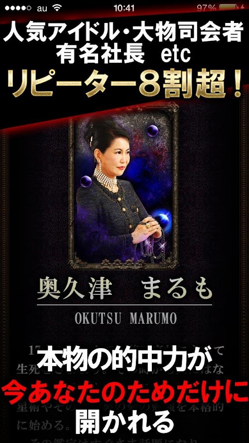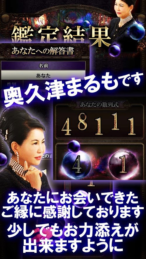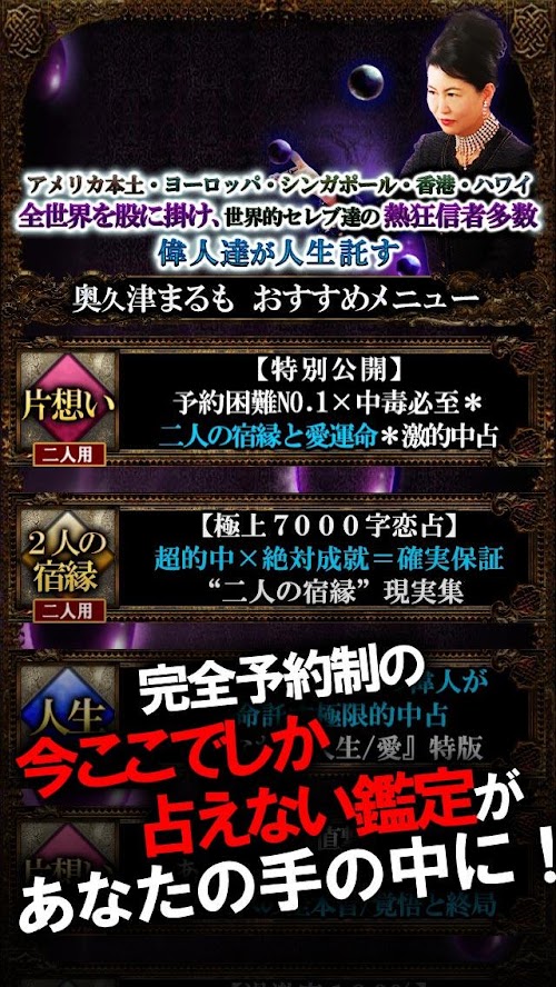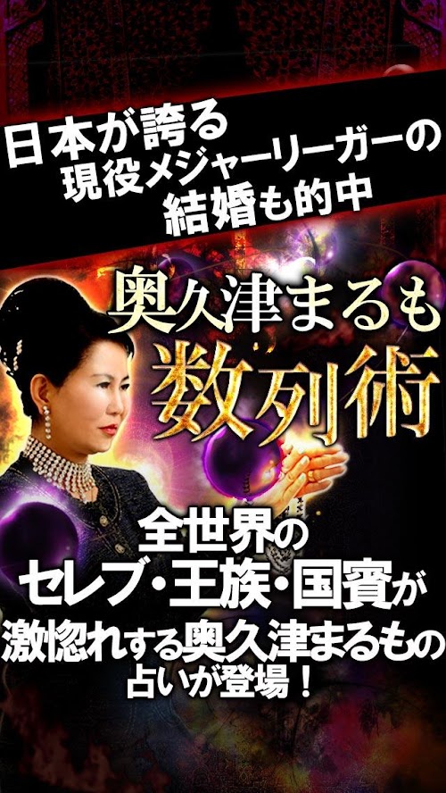 数の世界へようこそ。【TV絶賛×王族ご用達】全世界がその的中力に魅了される世界最高クラスの占い師【奥久津まるも】。日本が誇る現役メジャーリーガーと女子アナウンサーとの結婚を口添えし、各国王族・国賓、世界セレブなど超大物達が依存した今世紀最も予約が取れない占いが今、あなたのためだけに解放されます。