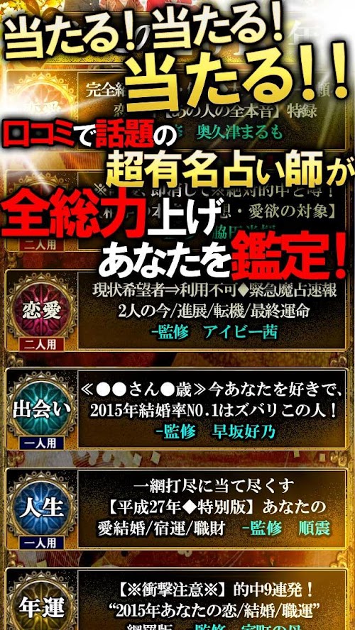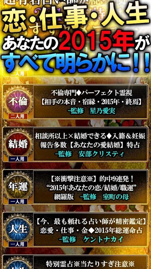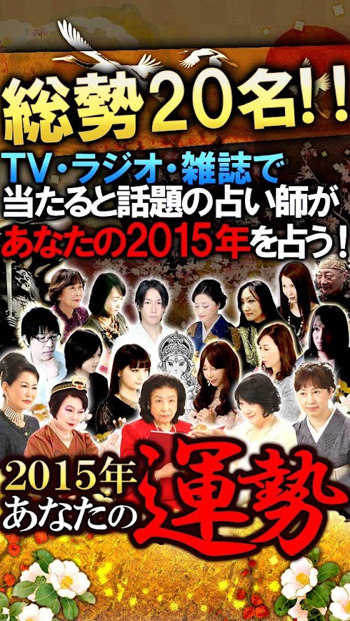 2014年、弊社アプリを御愛顧いただきまして誠に有難うございました。2015年のあなたに幸せが訪れますよう超豪華20人の占い師があなたの2015年を鑑定します。奇跡が起きる。本気で当たる。当たりすぎると噂の人気占い師たちの夢の共演を本アプリでお楽しみ下さい!