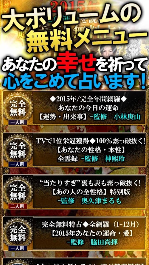 無料メニューは大ボリュームの5メニュー!2015年の毎日の運勢や、一か月ごとの運勢、金運、恋愛運、出会いまでドドーンと無料で提供します!2015年の初めはこのアプリから!あなたにとって幸せな1年になりますように!