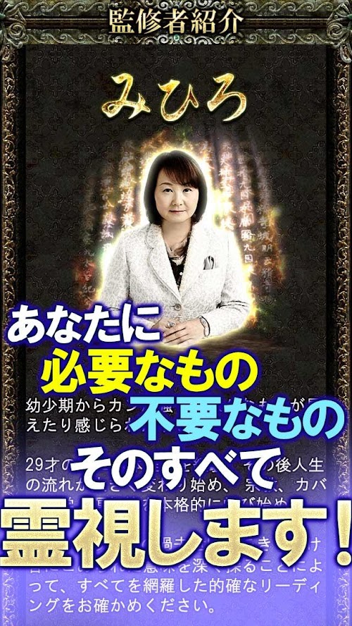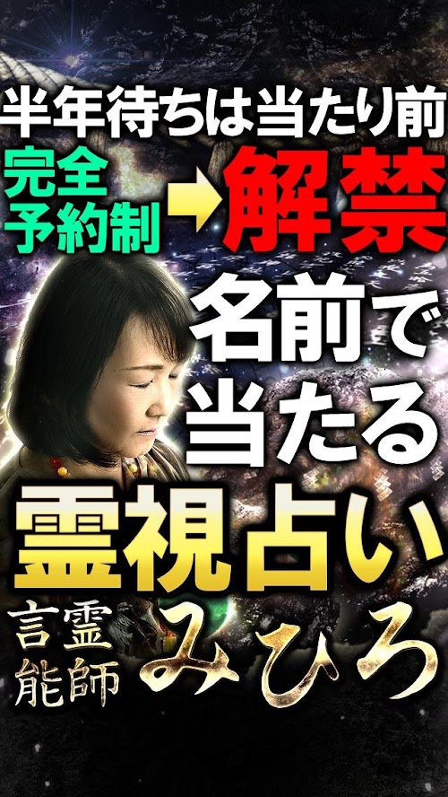 銀座で予約半年待ち。有名すぎて言葉にできない顧客多数。奇跡の現霊能師「みひろ」の特別な鑑定をアプリにてお楽しみください。