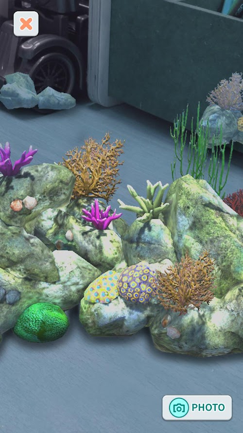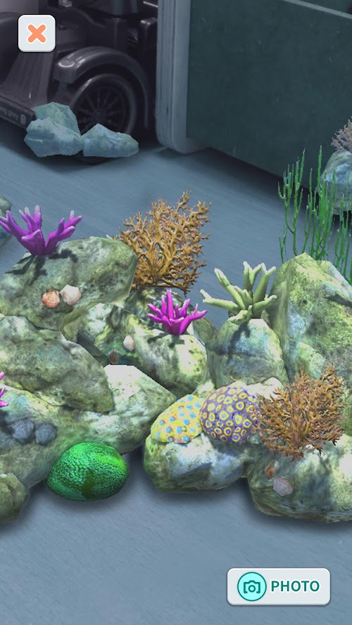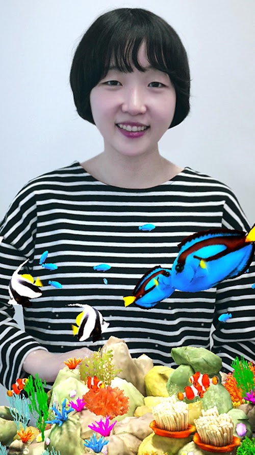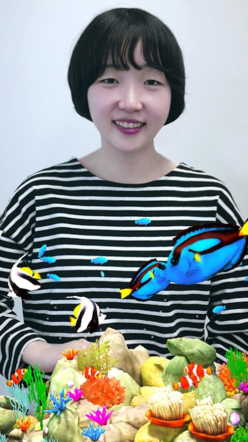 画面にたくさんの魚が現れて、海中を泳ぐ様子を3Dアニメーションで楽しめます!魚たちと一緒に写真を撮ることもできます。