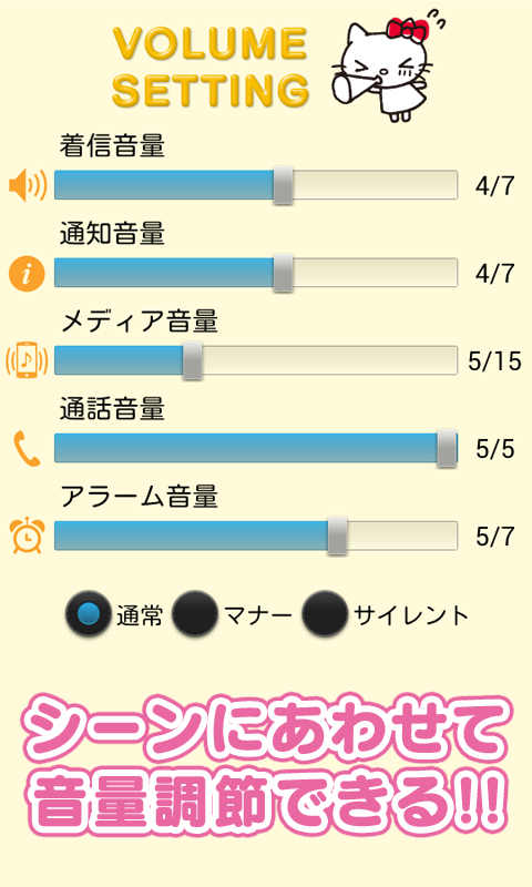 「通常、マナーモード、サイレント」と大きく3つに区分して設定する事もできます。