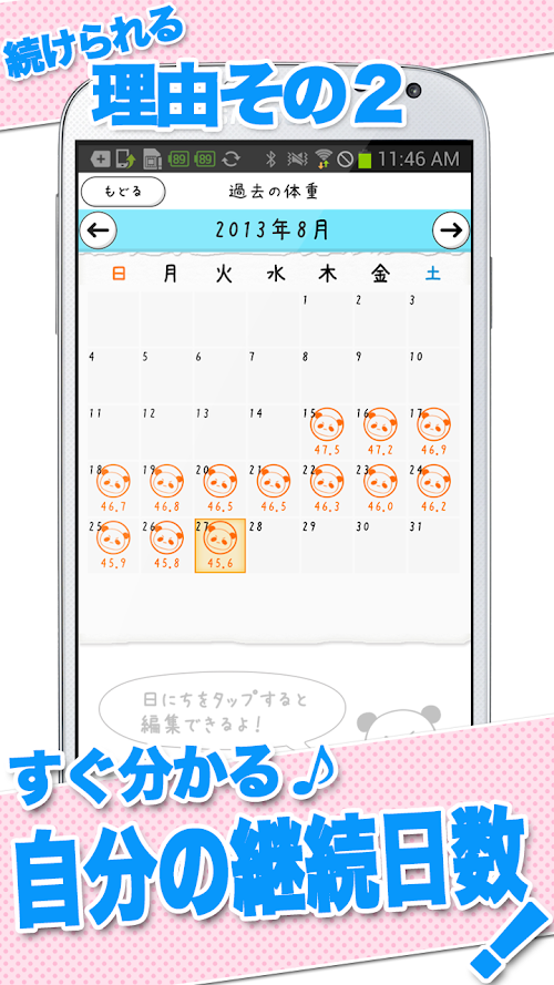 ・体重を入力するとたーぱんスタンプが押される。継続率UP!