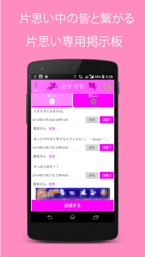あなたの片思い中の日頃のモヤモヤを「嬉しい」こと、「悲しい」ことを簡単に投稿出来ます!