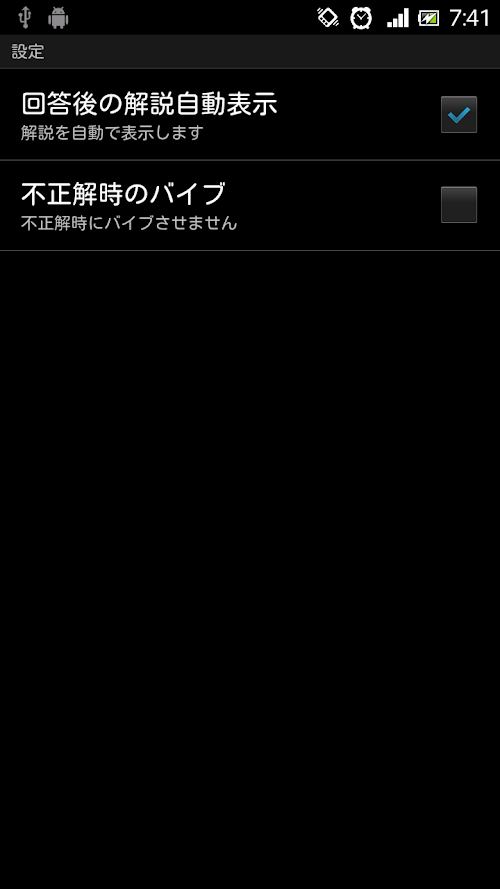 ・不正解時のバイブ設定や回答後の解説自動表示の設定も可能