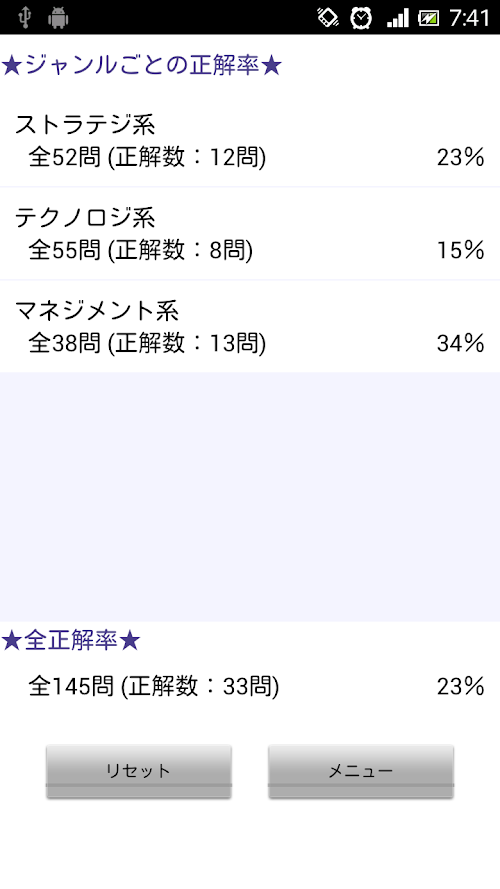 ・ジャンルごとの正解率表示IPA (Information-technology Promotion Agency) is carried out is a past issue of "IT passport test".