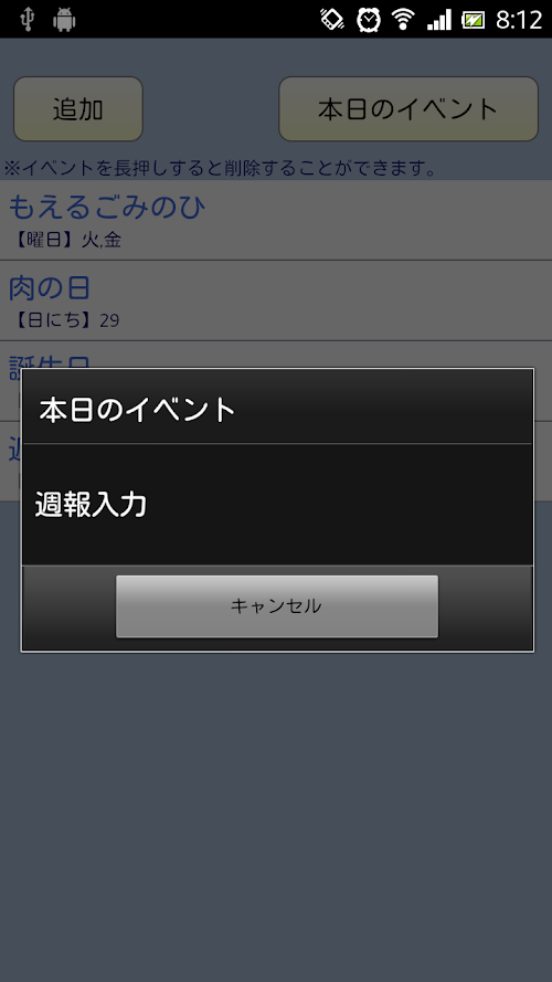 また、「今日のイベント」ボタンで今日のイベントを確認できます。