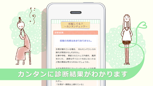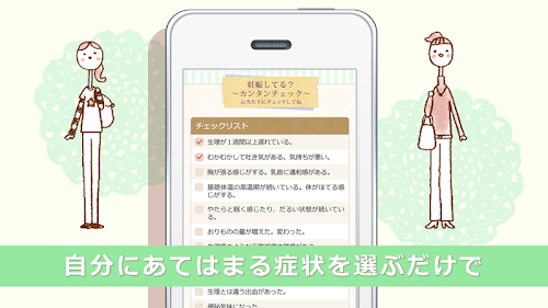 「生理がこない・・・」「生理が遅れている・・・」「避妊に失敗した・・・」「避妊をしていなかった・・・」など、妊娠したかもと不安に思っている方のための簡単に妊娠初期症状をチェックすることができるアプリです。