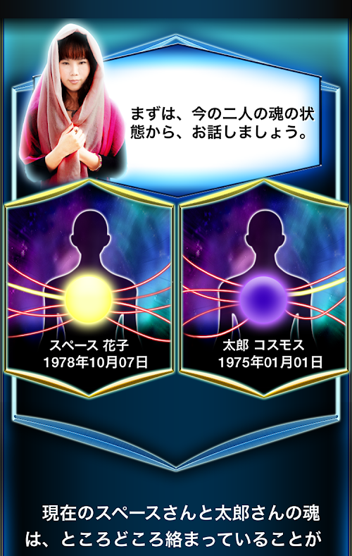 このアプリでは「北国の巫女」こと鮫島礼子の占い鑑定を受けることができます。