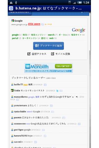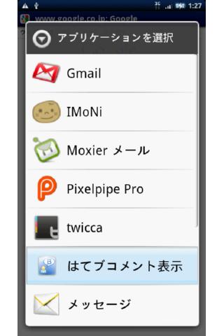 コメントが見たいページをブラウザ上に表示させた状態で、メニューボタンから「その他」 →「ページを共有」→「はてブコメント表示」を選択すると、そのままブラウザ上にコメント一覧ページが表示されます。"Hate blanking comment display", you can use the page sharing capabilities of Android standard browser, is an app that can be derived from any page Hatena bookmark to the comment list page.