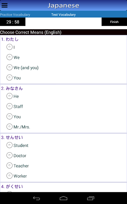 4. ラストテスト:総合テストです。自分の能力をチェックするためです。This application software is intended to provide entry-level, the Japanese basic course.