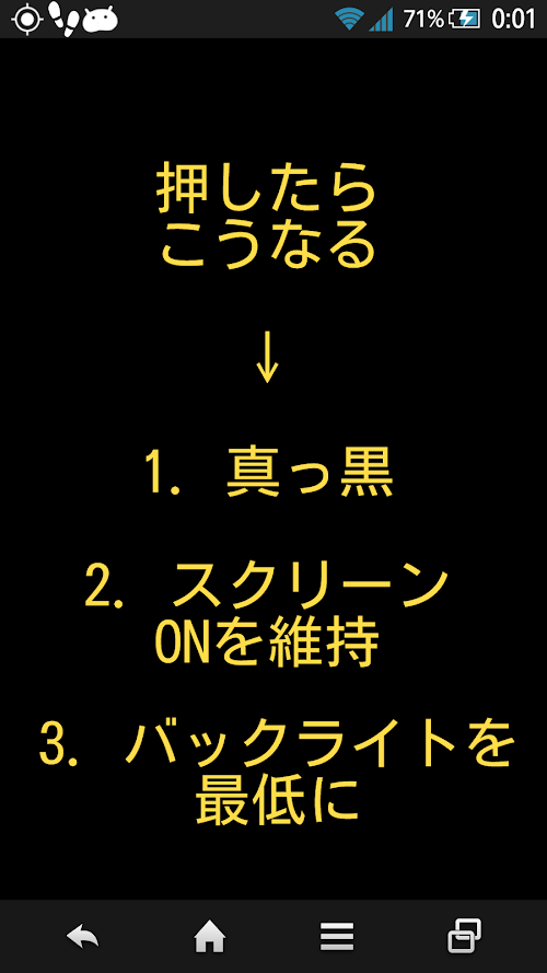 ・画面を真っ黒にした状態では、端末はロックしません(背後のアプリは動作し続けるので電池が消耗し続けます)