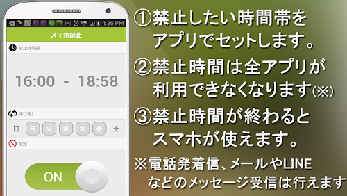 ※1…電話の発信(緊急な電話)や着信、メールやLINEなどの受信は禁止中も問題なくできますので安心してご利用ください。smartphone is prohibited timer smartphone addicts only