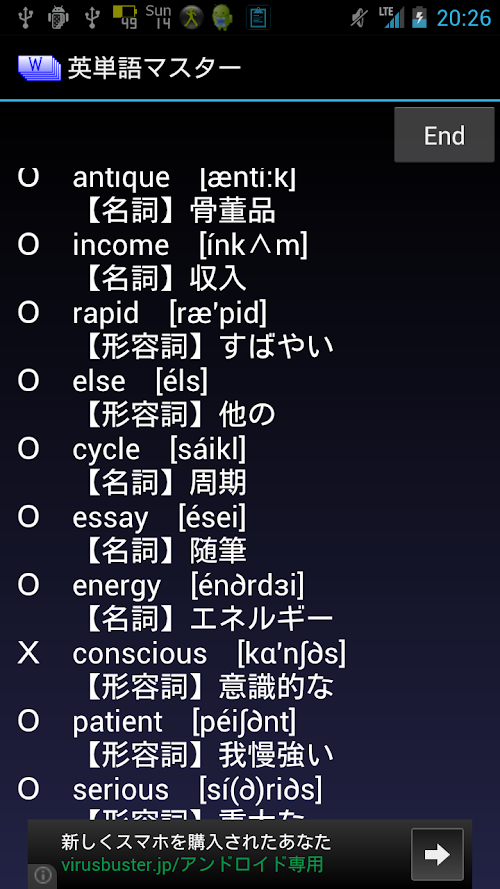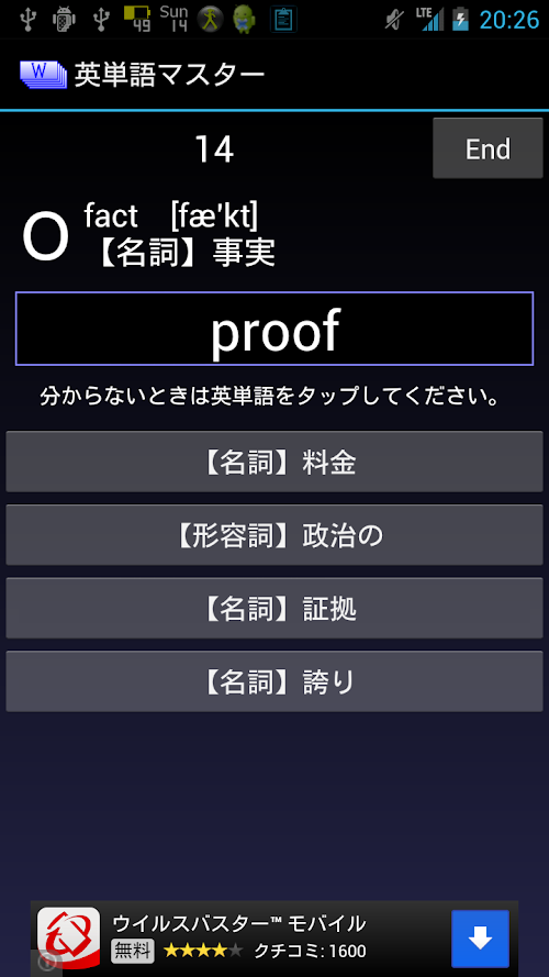 演習中は上から順に、問題数・前問の正誤・前問の問題・前問の発音記号・前問の解答・問題・4つの選択肢、が表示されます。