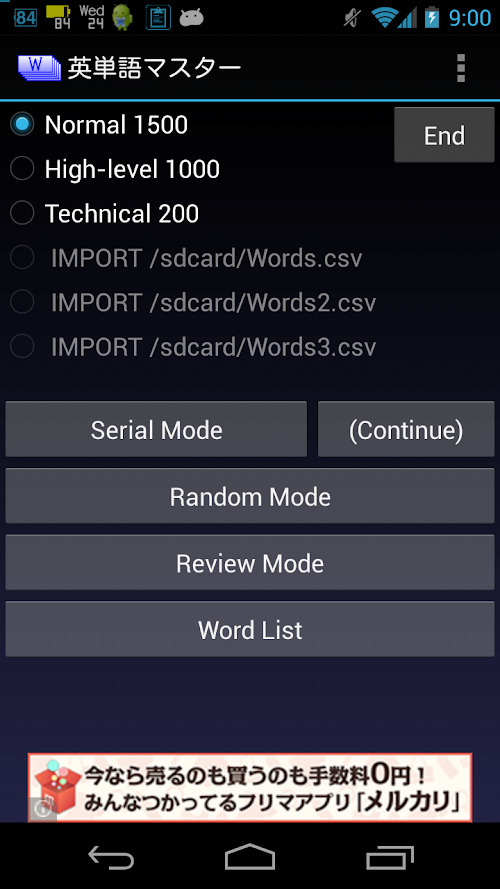 2450個の単語がプリインストールされていますが、SDカードの直下にWords.csvという名前のcsvファイルを置くことで、お好きなデータを読み込むことができます。
