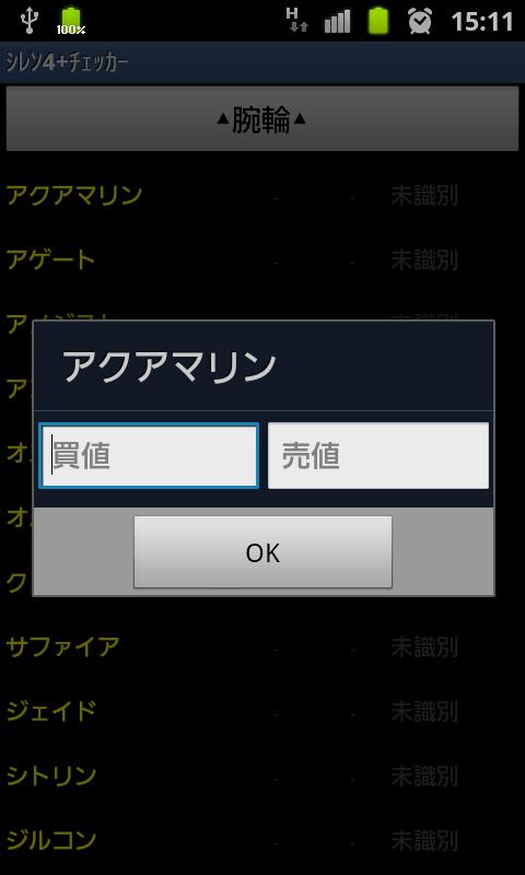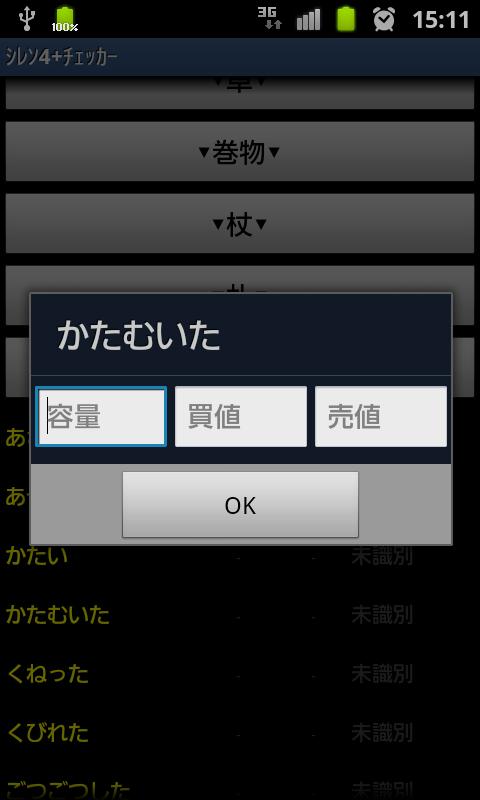 腕輪、草、巻物、杖、札、壺の未識別の名称をタップすると値段の設定ダイアログが出ます。壺の場合は容量も設定可能です。