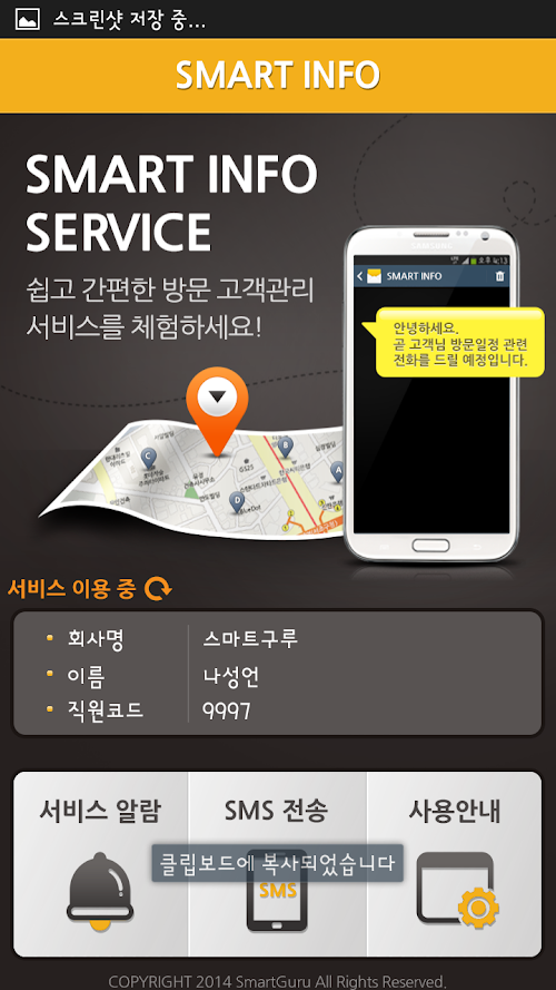 이용절차는 B2B로 계약된 기업 소속의 이용자만 사용할 수 있으며, 이용자는 스토아에서 ‘Smart Info 앱’을 다운받아 소속회사의 본인확인 절차를 거친 후 사용할 수 있습니다.