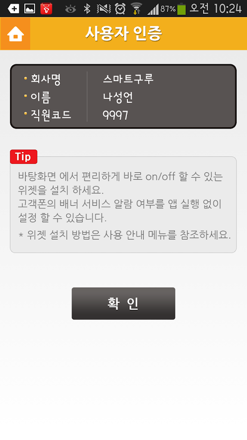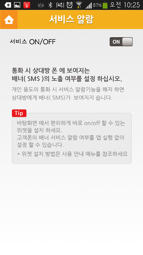 - 위젯 제공 : 위젯에 등록된 배너 알람 on/off, SMS 전송 바로 가기