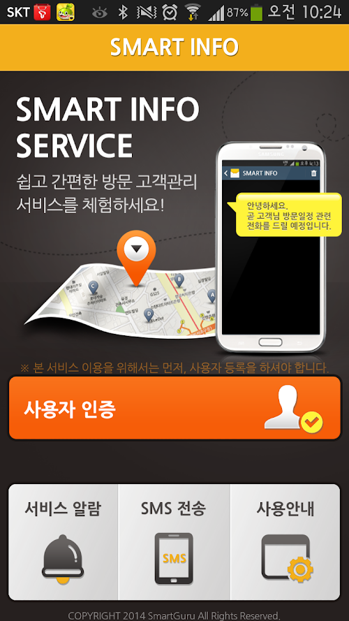 앱의 주요기능은, 이용자 본인확인 및 승인, 배너 ON/OFF기능, 다수개의 SMS등록 및 전송기능이 제공됩니다. 최초 1회 본인확인 후에는 앱을 실행하지 않고 기존처럼 바로 전화를 이용하면 됩니다.